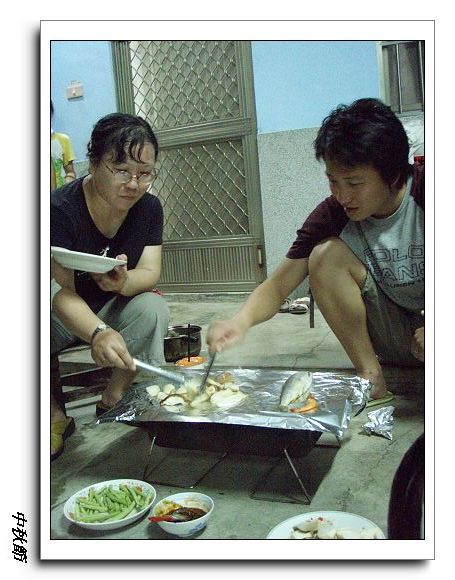 舅媽們準備的食物非常多,豬肉、蝦、香腸、蛤蠣、甜不辣、玉米、香魚........我們一到的時候,就已經香氣逼人了。在朋友間很愛烤的張少爺,到了家人面前,幾乎沒有動手的餘地。兩個乖巧的表弟,忙著展現廚藝,但好像一直被我們批評肉和四季豆都沒熟。而兩個舅媽也一直忙裡忙外,醃肉一包包地拿出來,相當忙碌。我既然插不上手,只好一直陪笑聊天,順便隨時動手整理垃圾。即使雨下下停停,但在棚子下烤肉的歡樂情況,還真是開心。這和以前在台北,在叔叔家或是我們自家烤肉的感覺不太一樣,可能是偶爾流竄出的客家話,讓我只能傻笑,但一大家子的氣氛,還滿熱絡的,笑聲不斷,也讓我這算是結婚之後第一次回婆家,稍稍緩和了緊張。